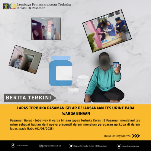 Jajaran Bagian Kasiminkamtib dan Keperawatan Lapas Terbuka Pasaman Kembali melakukan tes urine kepada Enam orang WBP Lapas Terbuka Pasaman, Kamis (01/06). “Kami melakukan deteksi dini pada Lapas Terbuka Pasaman , hal ini kita lakukan karena tren kasus narkoba meningkat cukup tinggi di Sumatera Barat. Kami tidak mau WBP Pemasyarakatan terlibat dan kami wajib melakukan deteksi dini, salah satunya dengan melakukan tes urin kepada WBP,” tegas Kasiminkamtib di Lapas Terbuka Pasaman