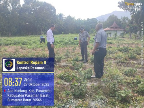 Pasaman barat – Kepala Lembaga Pemasyarakatan (Lapas) Terbuka Pasaman melakukan pemantauan langsung terhadap kegiatan gotong royong warga binaan dalam perawatan tanaman nilam di lahan pertanian pembinaan, senin(27/10). Kegiatan ini merupakan bagian dari upaya Lapas Terbuka Pasaman dalam memastikan program pembinaan kemandirian di bidang pertanian berjalan dengan baik, efektif, dan berkelanjutan.