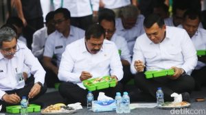 Menteri Imigrasi dan Pemasyarakatan makan siang bersama warga binaan, juga didampingi wakil menteri imigrasi dan Pemasyarakatan, Pimpinan Tinggi dan Ka.UPT Pemasyarakatan.