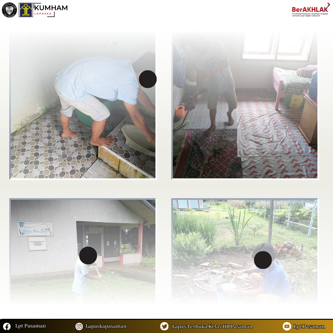 Tidak hanya barak/Kamar Hunian, kegiatan bersih-bersih juga meliputi seluruh area lingkungan Lapas. Salah satunya adalah area Rumah Ibadah yaitu Mushola AL-Ikhlas, ruang kunjungan, serta area umum lainnya hingga perapihan tanaman yang tersebar diseluruh area Lapas.