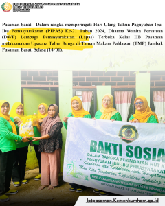 Pasaman barat – Dalam rangka memperingati Hari Ulang Tahun Paguyuban Ibu-Ibu Pemasyarakatan (PIPAS) Ke-21 Tahun 2024, Dharma Wanita Persatuan (DWP) Lembaga Pemasyarakatan (Lapas) Terbuka Kelas IIB Pasaman melaksanakan Upacara Tabur Bunga di Taman Makam Pahlawan (TMP) Jambak Pasaman Barat. Selasa (14/01).